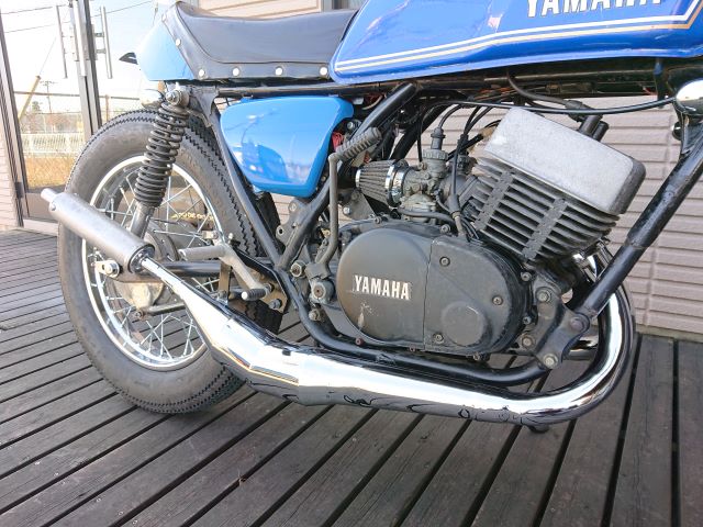 フロント周りは他社製のものをインストールし前方にオフセット。スイングアームは他車種のものを使いロンスイ化、ホイール等も変更しており一回り大きくなっております。RDの特徴のこの角タンクを活かしサイドカバーやリア周りをそれに合わせバランス良く制作。ワンオフチャンバーやそれに伴うサイドスタンド、ヘッドライト周りはフルオリジナル。旧車の魅力を最大限活かしたヘッドライトからリアまでの一直線に並ぶ外装は拘りのフルフラットです。