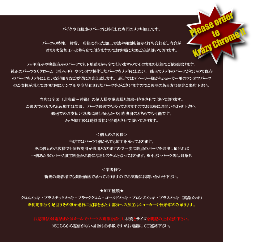 群馬県高崎市 クレイジークロム 中古車販売・車検・カスタム・パーツ製作からメッキ加工まで可能なバイクショップです。気軽に遊びに来て下さい!